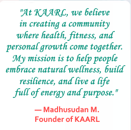 Meet Madhusudan, a Senior Manager in an IT firm, KAARL reflects his deep passion for fitness, wellness, and making a difference. Madhu stepped beyond his corporate role during the COVID-19 pandemic to lead online fitness sessions, helping people stay active, motivated, and connected. What started as a way to lift others through challenging times became a bigger vision: a dedicated space where people can gather, play, and embrace holistic, natural health.